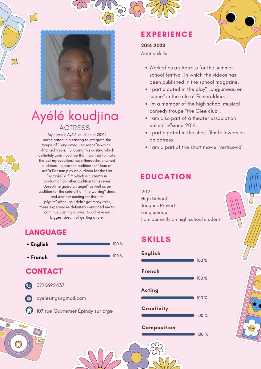 My name is Ayélé Koudjina in 2019 I participated in a casting to integrate the troupe of "Longjumeau en scène"in which I obtained a role. Following this casting which definitely convinced me that I wanted to make the act my vocation,I have thereafter chained auditions.I quote the audition for "Joan of Arc"a Parisian play an audition for the film "karaoke" a film which is currently in production an other audition for a series "Josephine guardian angel" as well as an audition for the spin-off of "the walking" dead and another casting for the film "pilgrim".Although I didn't get many roles, these experiences definitely convinced me to continue casting in order to achieve my biggest dream of getting a role.
